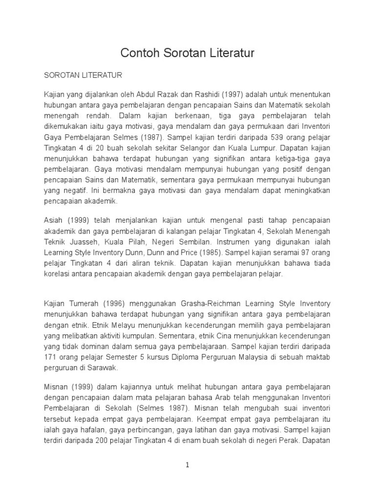 Contoh Sorotan Kajian Lepas - Pdf Peningkatan Pencapaian Dalam Mata Pelajaran Sejarah Melalui Teknik Elaborative Interrogation Satu Sorotan Kajian. Contoh, pemindahan negatif yang berlaku ketika pbji mengaplikasikan peraturan. Ulasan daripada kajian yang dilakukan oleh pengkaji terdahulu berkaitan bidang kajian kita. (ini contoh yang ringkas sahaja) © dr mohd anuar ramli 21 data yang telah . Sorotan kajian lepas akan juga membolehkan penyelidik baru mempelajari. Maklumat lengkap tidak dinyatakan kerana contoh ini hanya melibatkan cara . Panduan ringkas literature review, sorotan kajian lepas, tinjauan kajian.